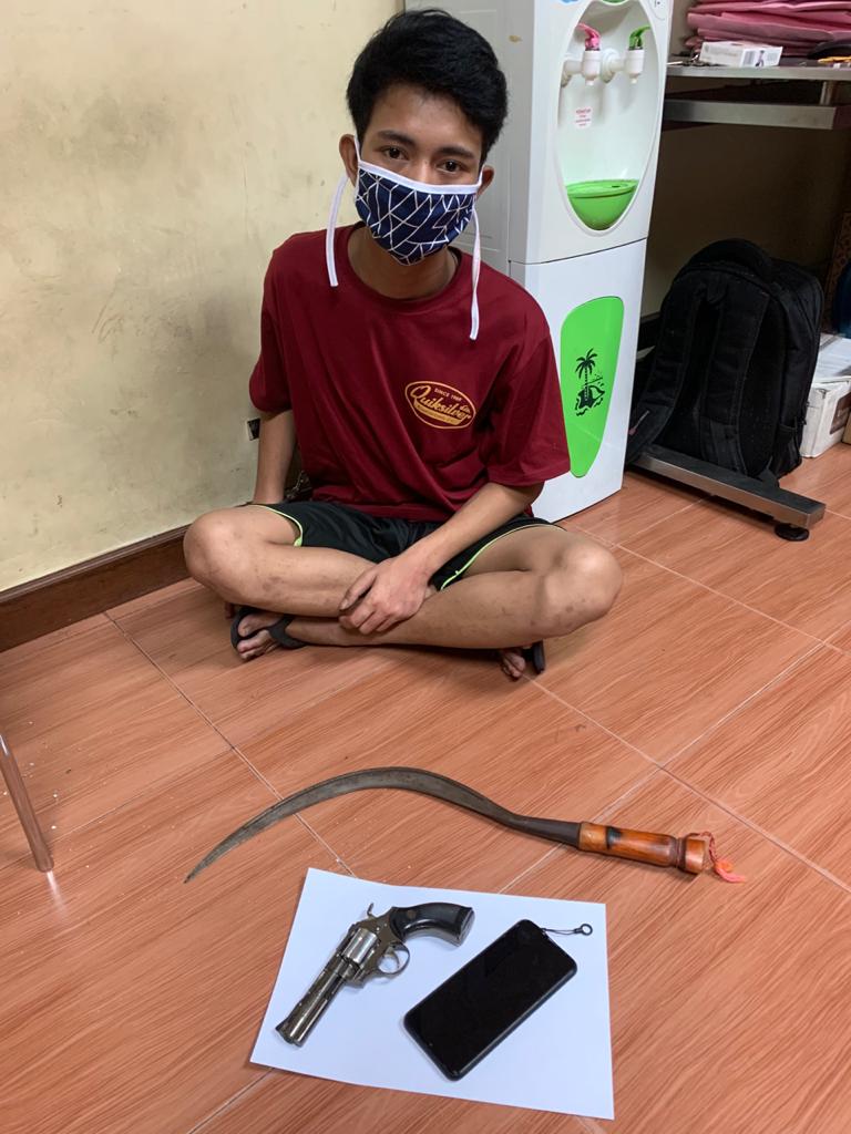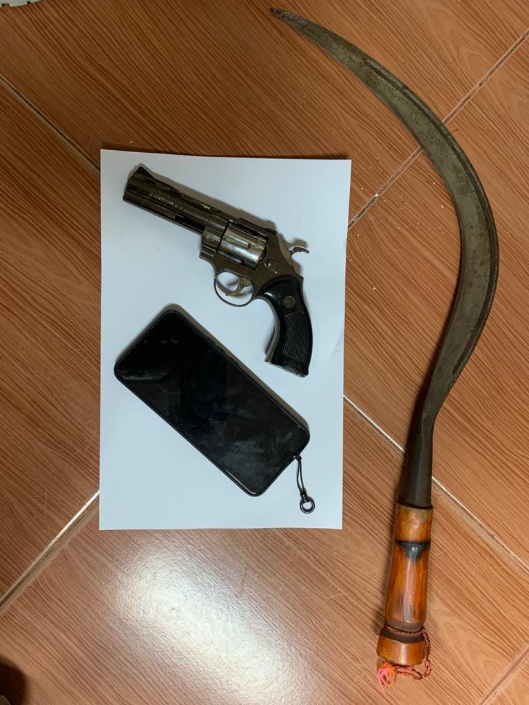 Dari penangkapan tersebut kami turut menyita senjata tajam berupa 1 buah celurit bergagang kayu, 1 pucuk senjata mainan korek api dan 1 unit hp merk infinix milik korban