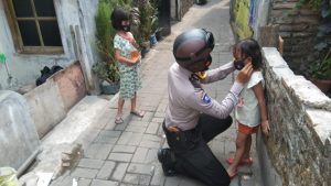 Selain memberikan masker, Bripka Achmad Haris juga menyampaikan himbauan kepada anak – anak tentang protokol kesehatan, untuk selalu menggunakan masker, menjaga jarak minimal 1 meter dan rajin mencuci tangan dengan menggunakan sabun dan air yang mengalir.