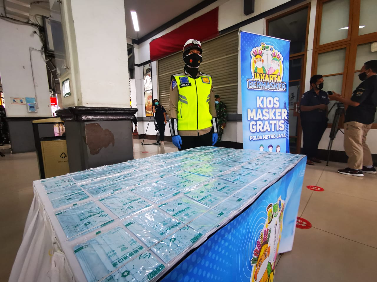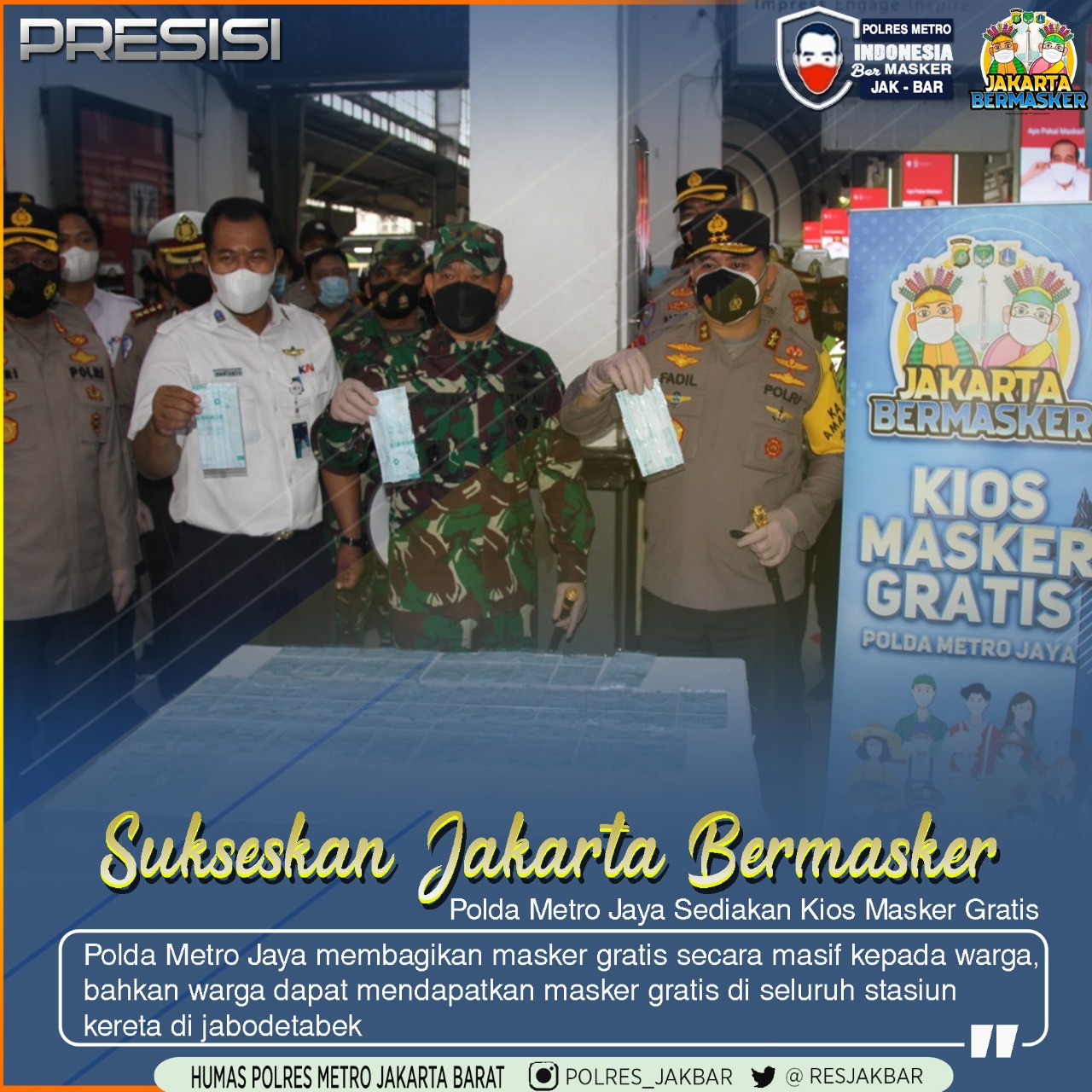 jakarta, Dalam rangka menyukseskan program ‘Jakarta Bermasker’, Polda Metro Jaya membagikan masker secara masif kepada warga. Bahkan warga bisa mendapatkan masker gratis di seluruh stasiun kereta di Jabodetabek.