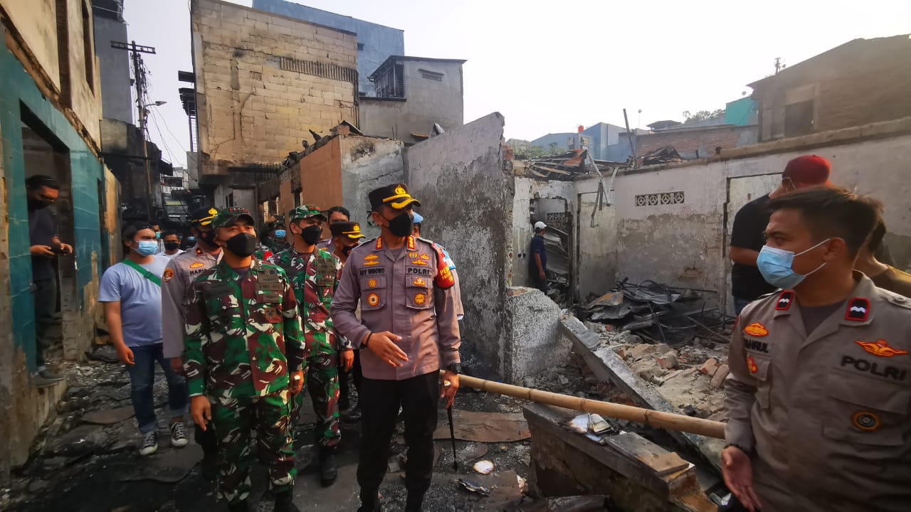 Jakarta, Kapolres Metro Jakarta Barat Kombes Pol Ady Wibowo didampingi Dandim 0503/JB Kolonel Inf Dadang Ismail Marzuki mendatangi lokasi kebakaran di jalan keadilan dalam 1 keagungan Taman Sari, Jakarta Barat.