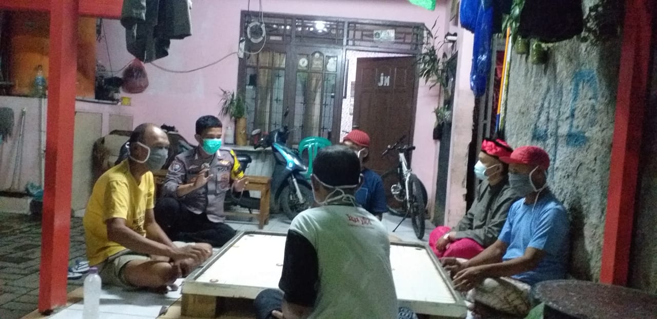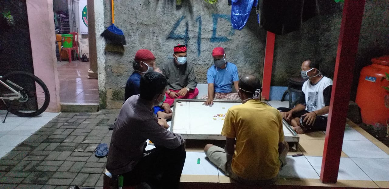 Bhabinkamtibmas duri Kosambi polsek Cengkareng Polres Metro Jakarta Barat Bripka Ahmad Haris menyambangi pos ronda yang berlokasi di rt 007/08 duri kosambi Cengkareng Jakarta Barat, Kamis malam, 6/5/2021.