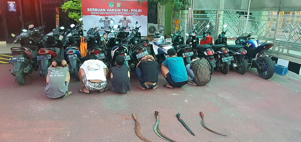 Sedikitnya 6 (enam) orang kelompok pemuda asal ” pademangan senen gunung sahari “ berhasil diamankan berikut 4 buah senjata tajam jenis celurit dan golok serta 19 unit kendaraan sepeda motor yang di tinggal pemiliknya saat petugas melakukan pembubaran aksi tawuran
