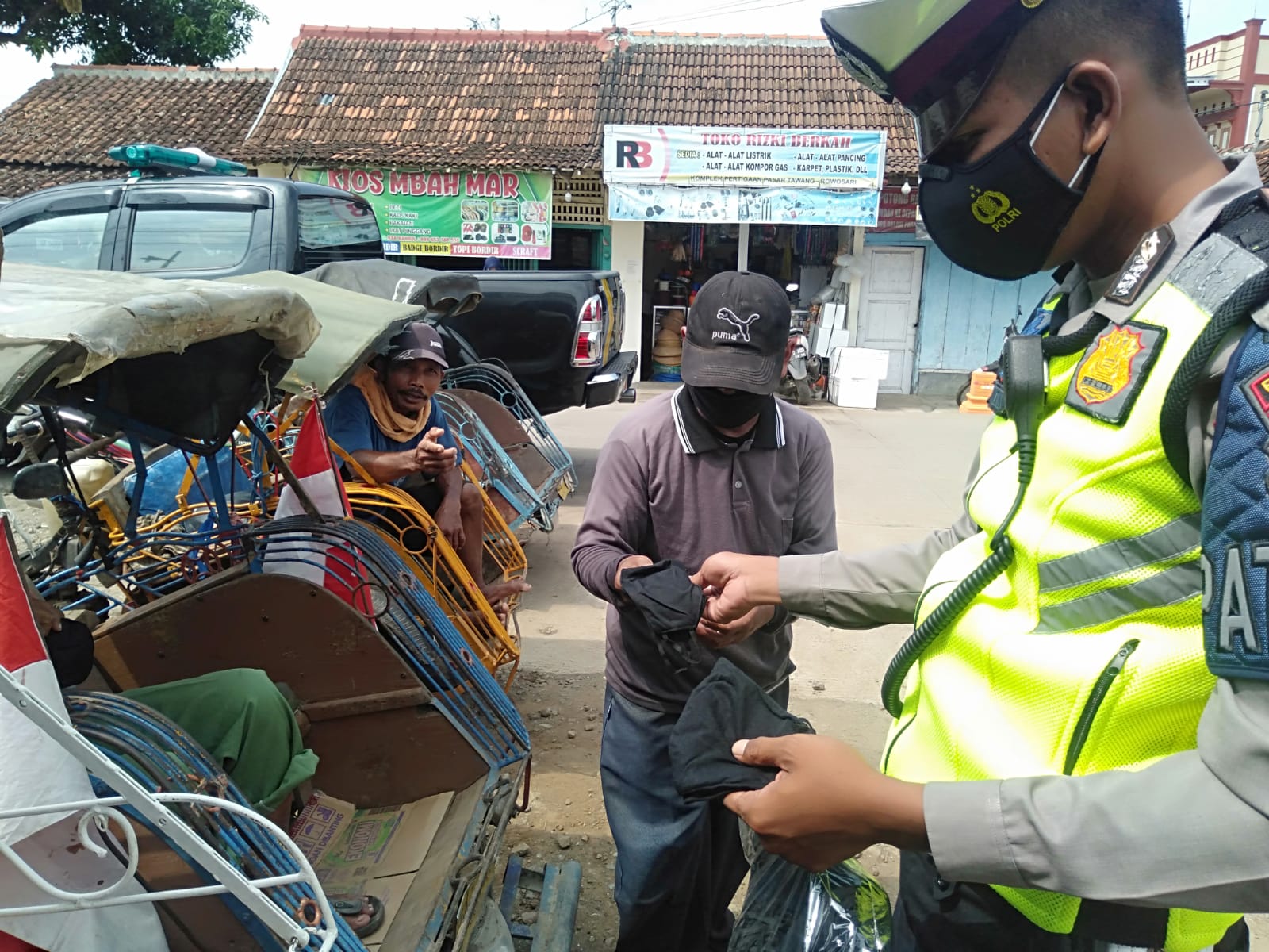 “Menghimbau untuk jaga jarak dan tidak berkerumun, memberikan himbauan akan bahaya penyebaran covid 19, dan mematuhi Prokes serta membagikan masker kepada masyarakat yang tidak memakai masker,” ujar Kasatlantas Polres Kendal