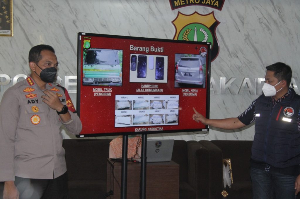 ” Dari hasil penangkapan tersebut tim bergerak setelah menerima informasi adanya pengiriman narkotika jenis ganja dari sumatera menuju jakarta ” ujarnya saat memaparkan Slide saat press conference