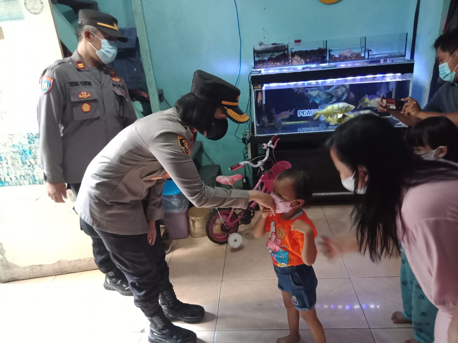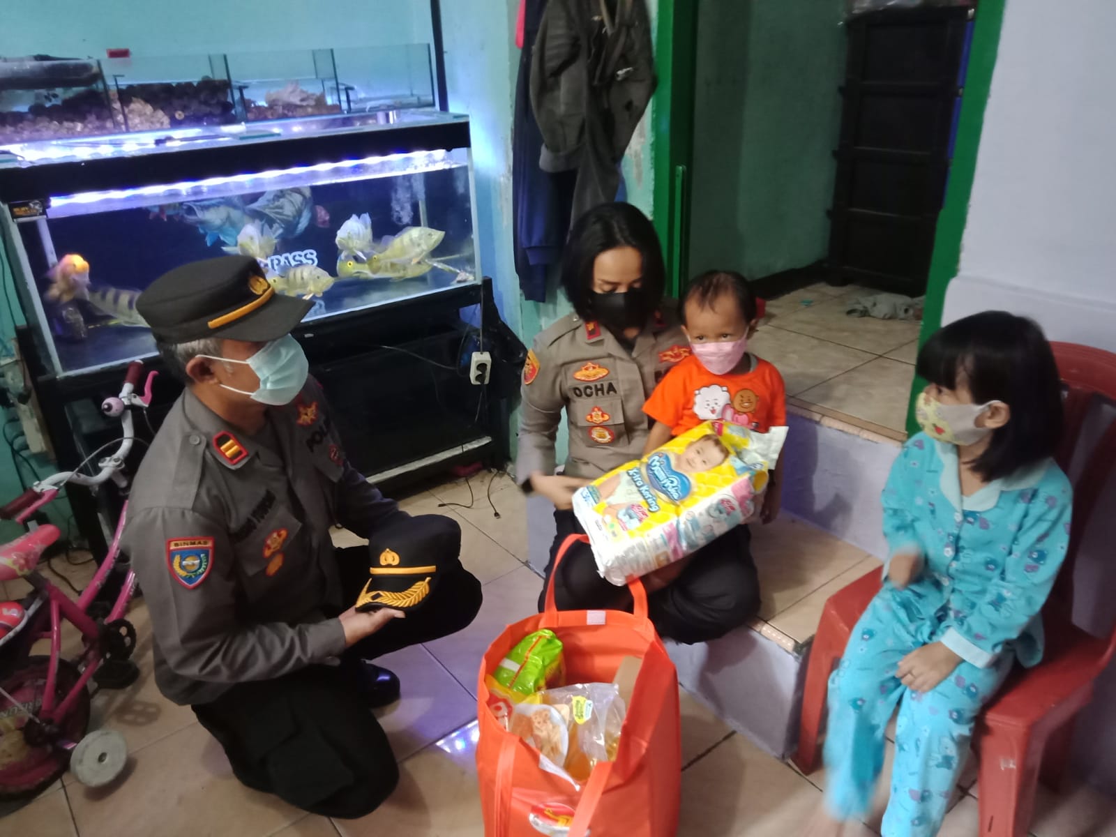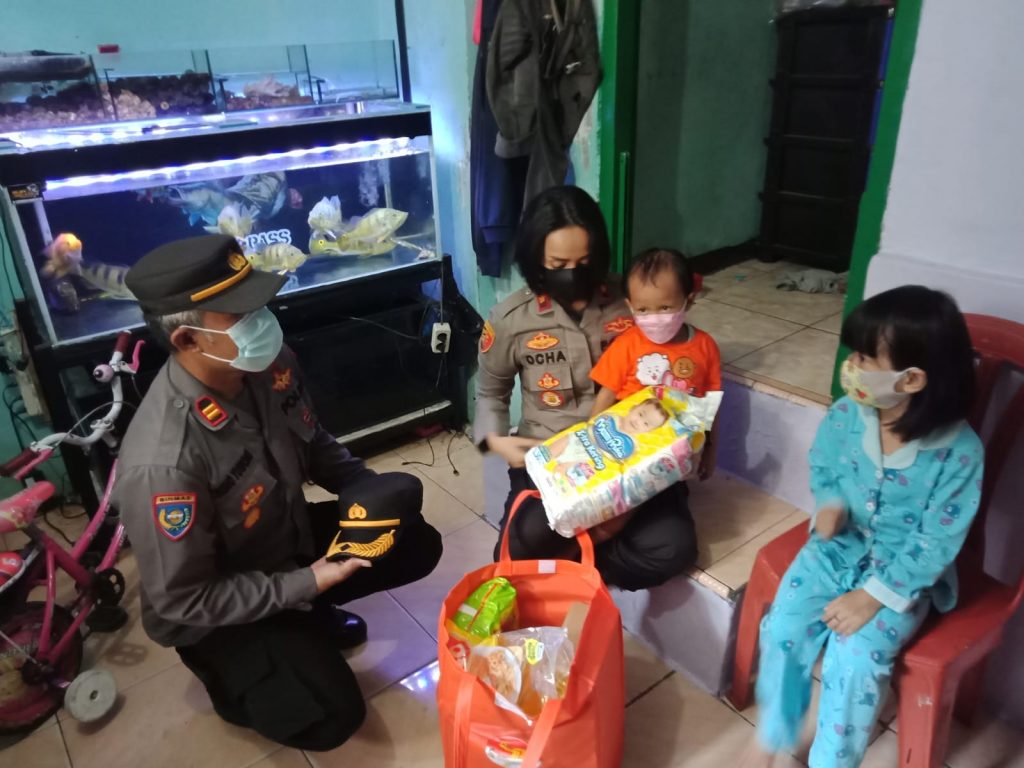 Saat tiba dikediaman Khanza, Kapolsek wanita yang biasa disapa Ocha itu tampak menggendong Khanza dan menuntun tangan Khanza mengambil salah satu dari beberapa bantuan santunan yang sudah disiapkan dalam kantong berwarna kuning orange.