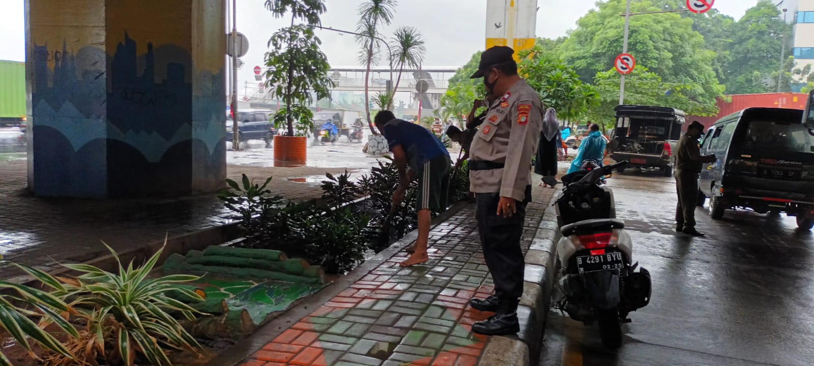 JAKARTA, Walau diguyur hujan tidak menyurutkan jajaran polsek Cengkaréng Polres Metro Jakarta Barat bersama 3 pilar dalam menggelar operasi yustisi di kolong jalan tol Tl Cengkareng Jakarta Barat, Selasa, 8/2/2022