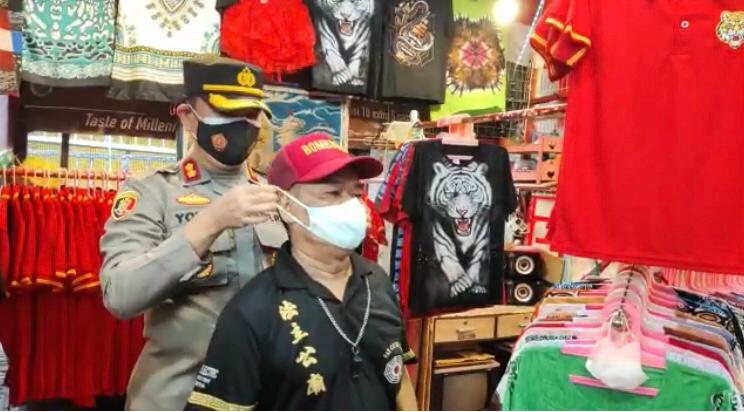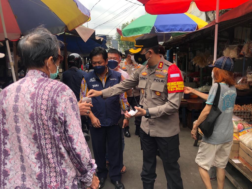 Kapolsek Metro Taman Sari Polres Metro Jakarta Barat Akbp Rohman Yonky Dilatha mengatakan kami membagikan masker kepada para pengunjung maupun pedagang yang berada di pasar petak IX Glodok Tamansari Jakarta Barat