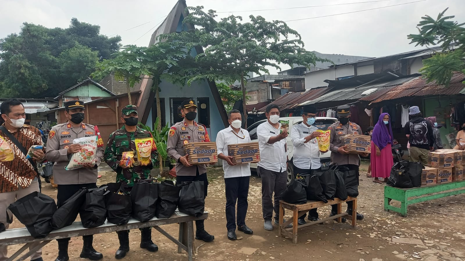 JAKARTA, Unsur tiga pilar Kecamatan Grogol Petamburan Jakarta Barat membagikan sembako ke warga yang berada di slum area RW 05, Kelurahan Tanjung Duren Selatan, Kecamatan Tanjung Duren, Jakarta Barat pada Jumat (4/3/2022)