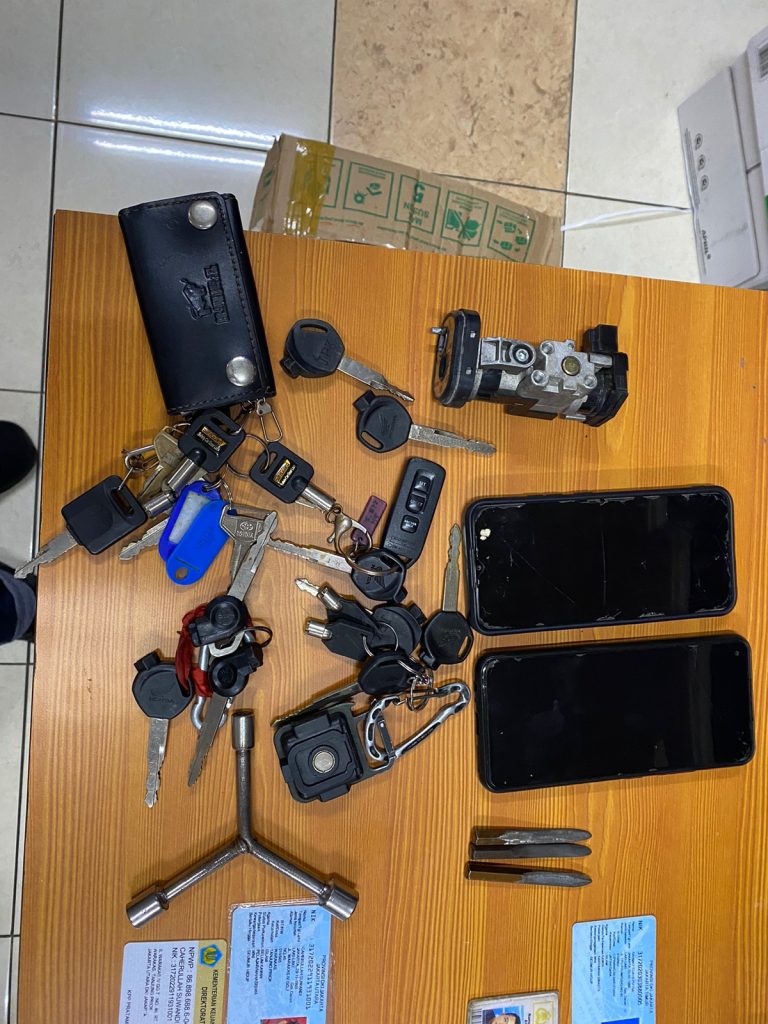 Sementara dikesempatan yang sama Kanit Reskrim Polsek kebon jeruk Akp Anggi Fauzi Arfandi menerangkan, dari hasil penangkapan tersebut kami berhasil mengamankan barang bukti berupa 1 unit sepeda motor Honda beat street No. Pol : G-4110-PI, warna hitam (sepeda motor milik korban), 1 unit sepeda motor Honda beat No. Pol : B-5743-FCT,warna Hitam. (Sepeda motor milik pelaku), 3 buah anak kunci leter T, 1 buah kunci T, 8 buah kunci kontak palsu, 4 lembar STNK sepeda motor, 1 lembar STNK MOBIL dan 2 Unit HP