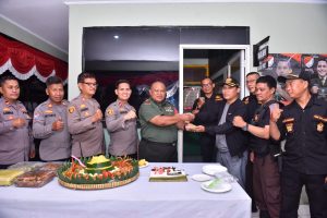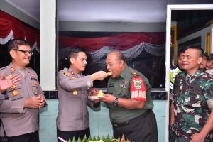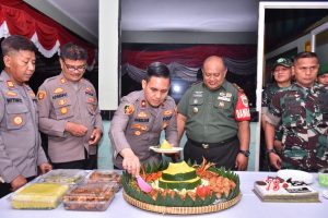Kapolsek Cengkareng bersama personel tiba di Markas Koramil 04/Cengkareng dengan membawa kue dan nasi tumpeng sebagai lambang persahabatan yang erat antara kedua lembaga penegak hukum ini.