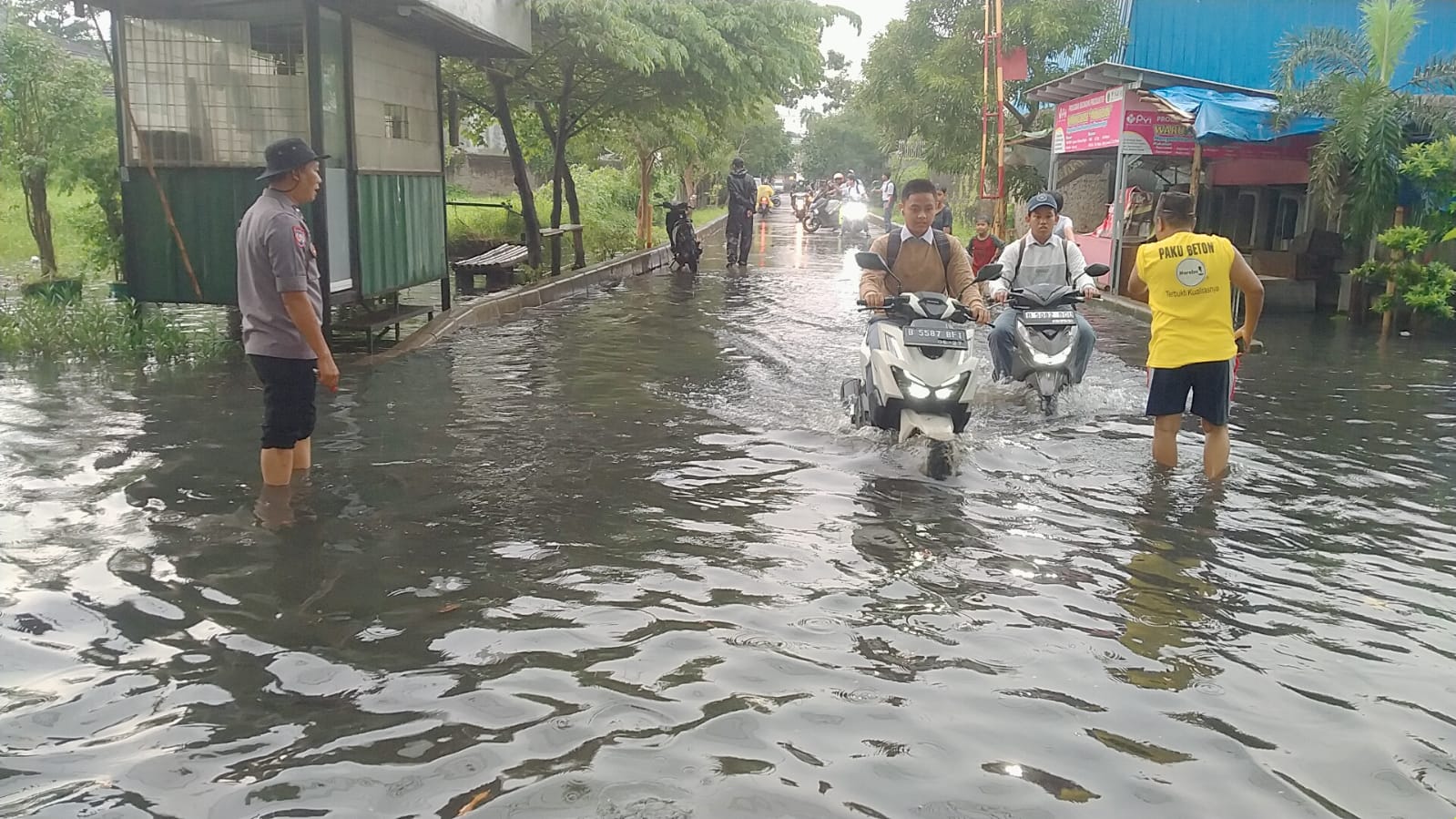 Selain itu, Bhabinkamtibmas juga terlibat langsung dalam membantu dan mengarahkan warga yang melintas agar tidak terjebak di area genangan.
