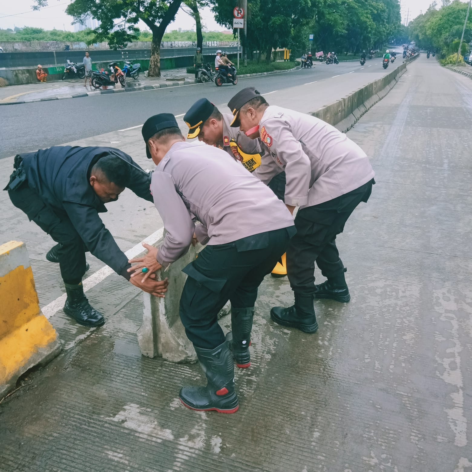 Petugas lainnya juga turut berupaya memindahkan barier yang terpasang di jalan agar kendaraan yang melintas bisa berjalan lancar dan menghindari genangan air.