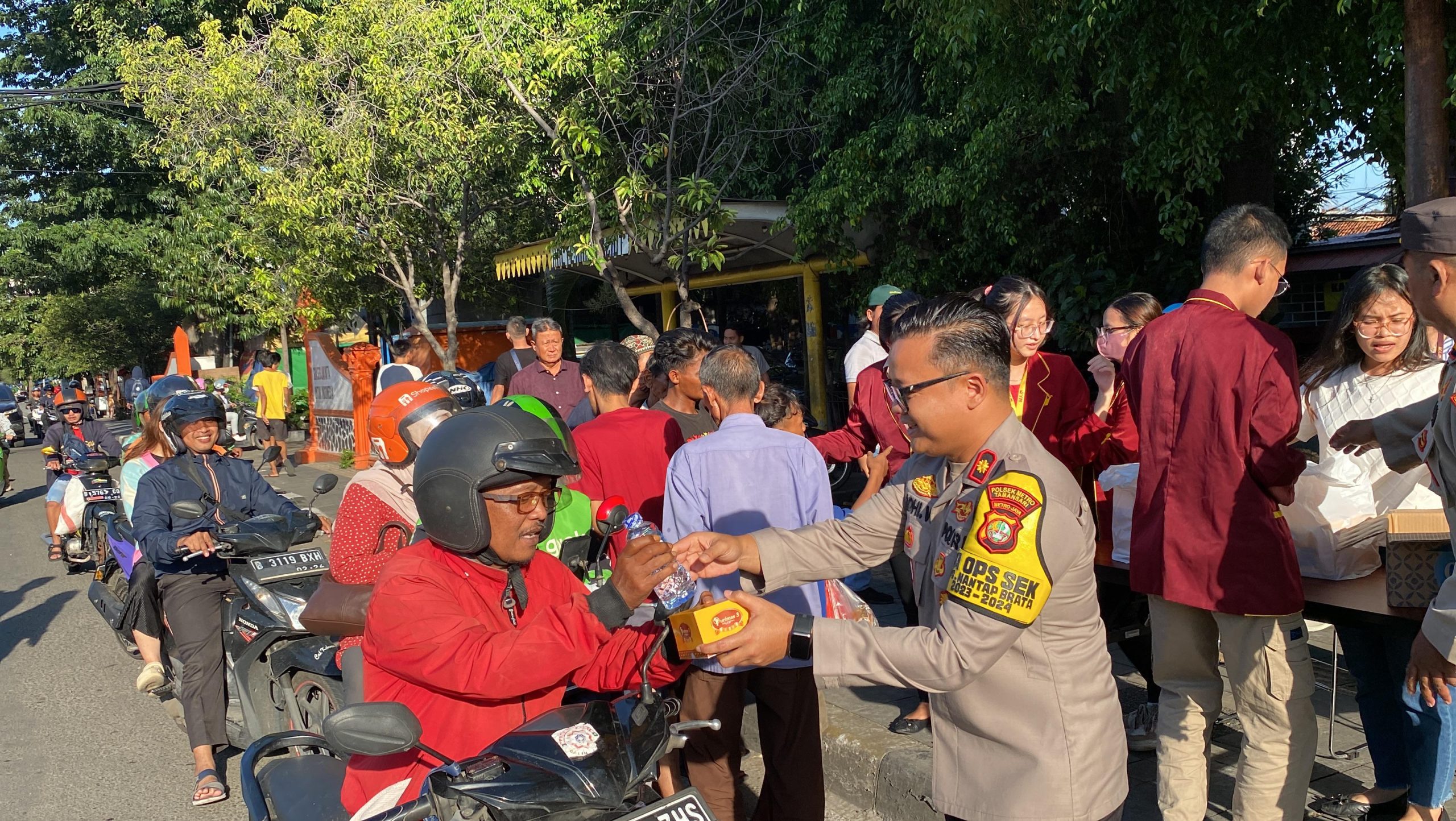 Jakarta Barat, Polsek Metro Tamansari Jakarta Barat menggelar kegiatan berbagi takjil bersama mahasiswa STIE Wiyata Mandala pada Rabu, 20 Maret 2024, di Jalan Mangga Dua Raya Pinangsia, Tamansari, Jakarta Barat.